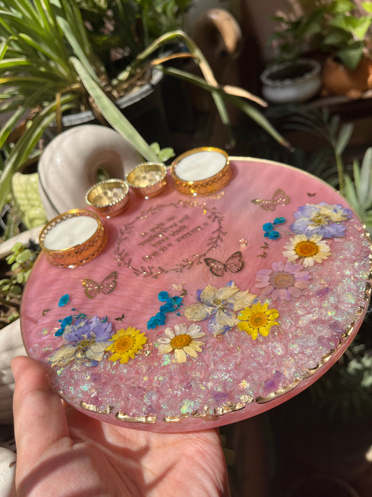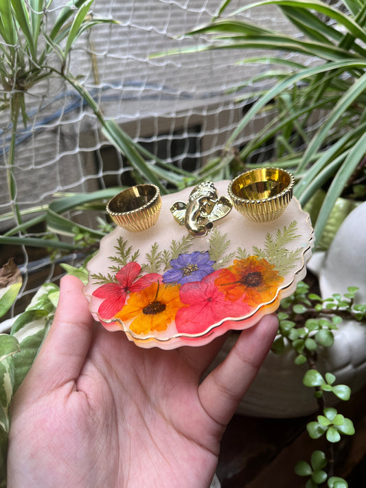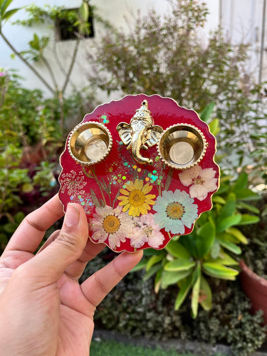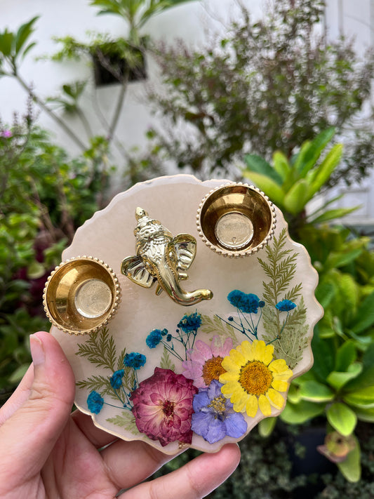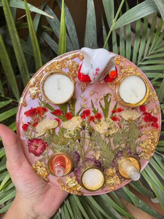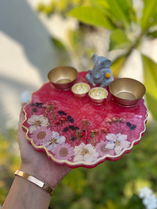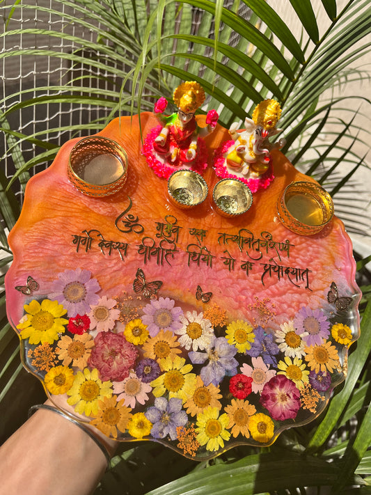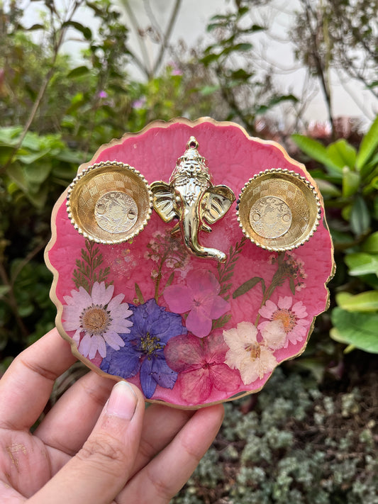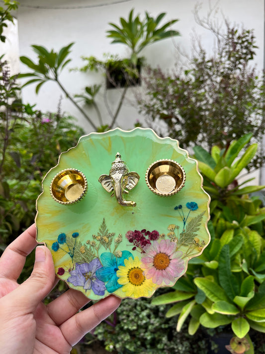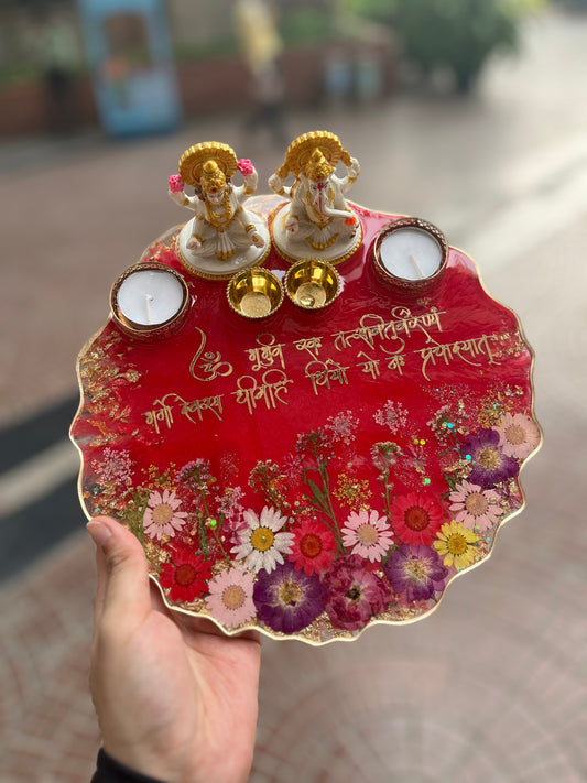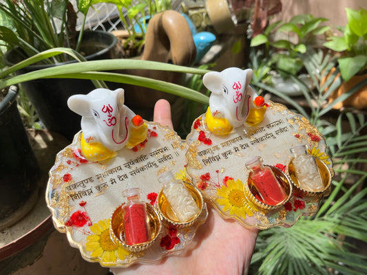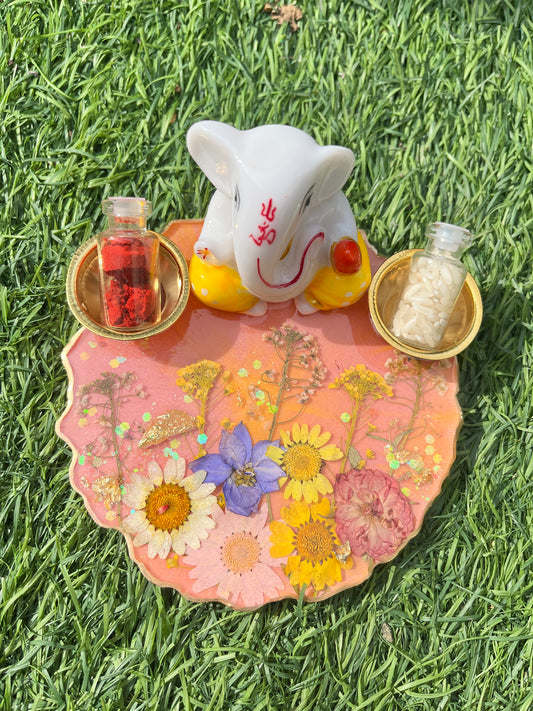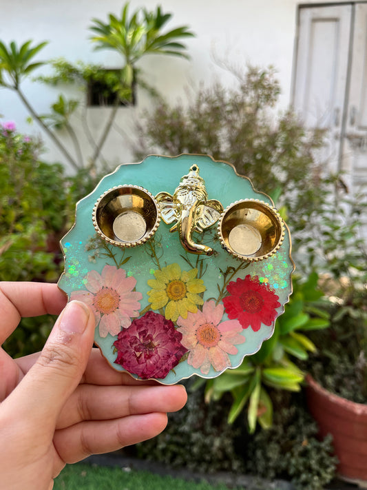 Introducing our Resin Pooja Thali Collection – a harmonious fusion of tradition and artistry. Explore an array of designs and sizes, each thali uniquely crafted and customizable to suit your preferences. Immerse yourself in the beauty of real botanicals preserved within the resin, adding a touch of nature to your sacred rituals. Elevate your spiritual space with our Resin Pooja Thali Collection, where diversity, customization, and the essence of nature come together in perfect harmony.