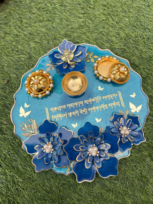 3D Blue Floral Elegance: Resin Pooja Thali (10 Inches)